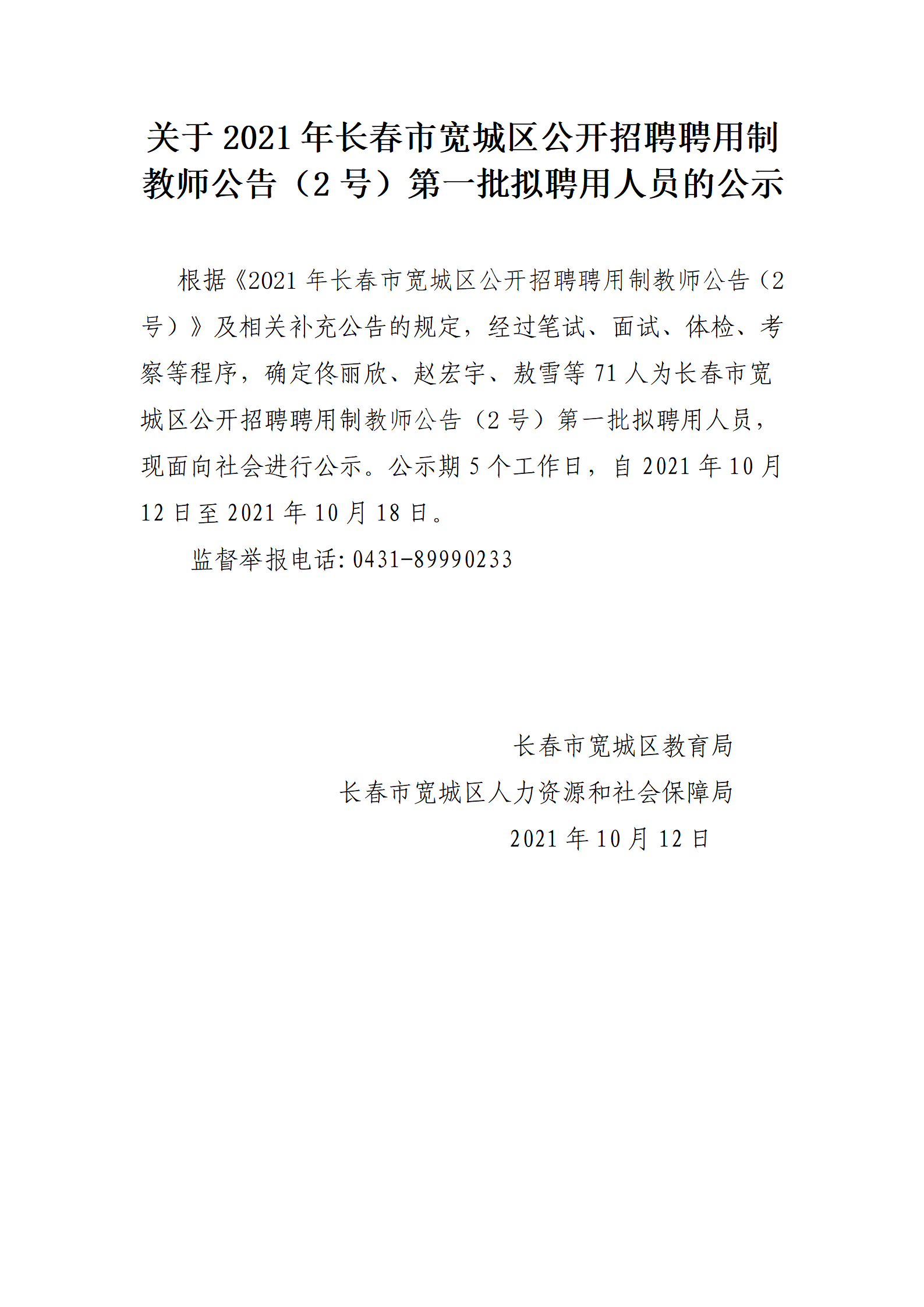 关于2021年长春市宽城区公开招聘聘用制教师公告(2号)第一批拟聘用人员的公示