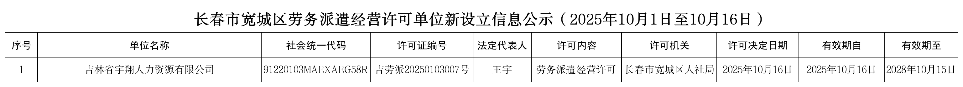 长春市宽城区劳务派遣经营许可单位新设立信息公示(2025年10月1日至10月16日)