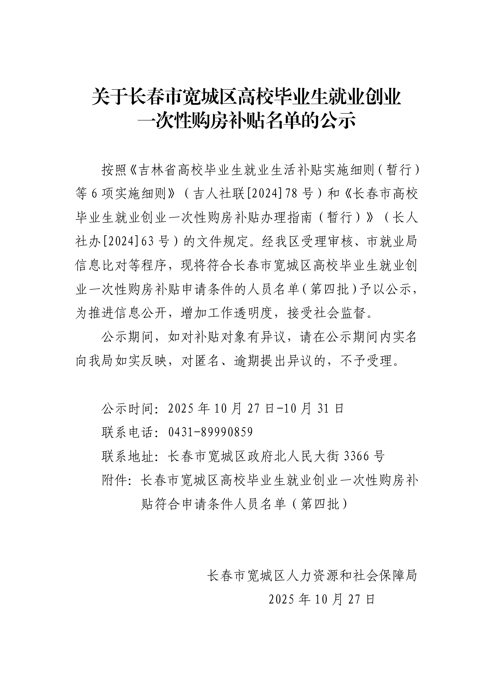 关于长春市宽城区高校毕业生就业创业 一次性购房补贴名单的公示