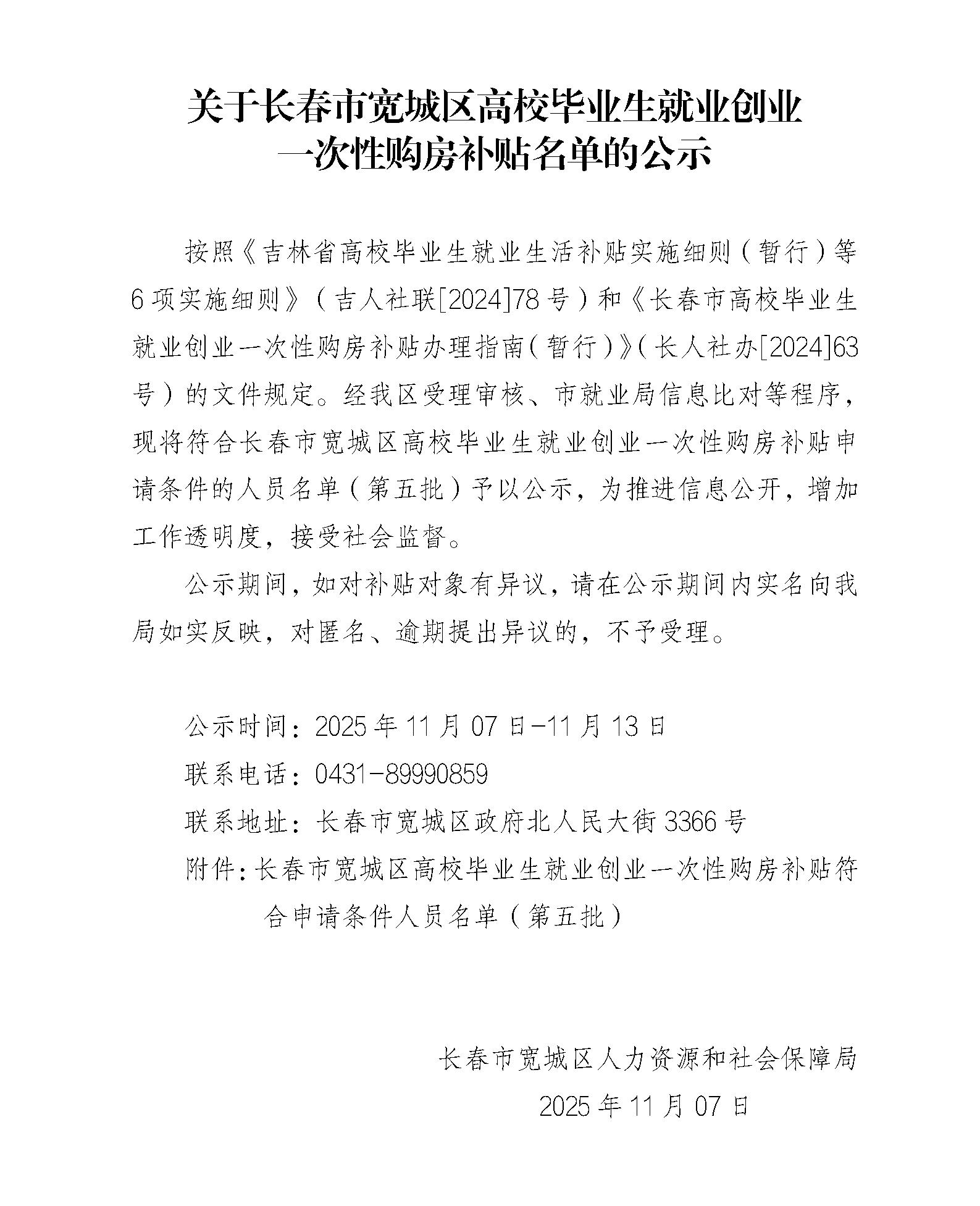 关于长春市宽城区高校毕业生就业创业一次性购房补贴名单的公示