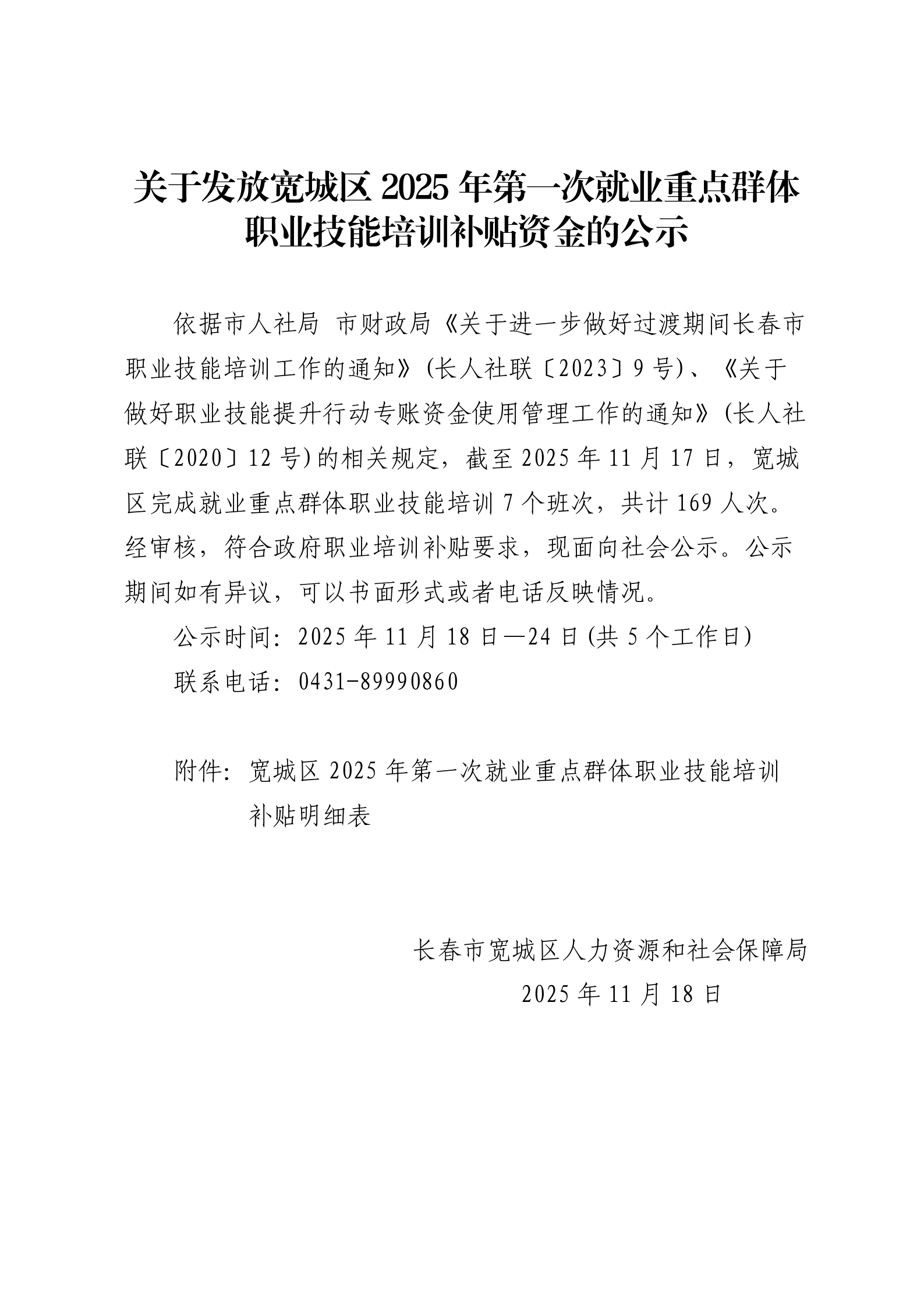 关于发放宽城区2025年第一次就业重点群体职业技能培训补贴资金的公示
