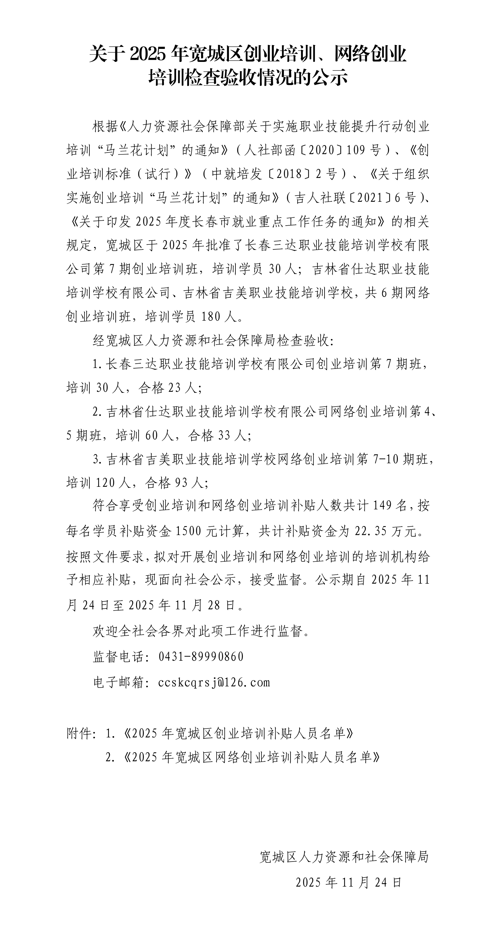 关于2025年宽城区创业培训、网络创业培训检查验收情况的公示