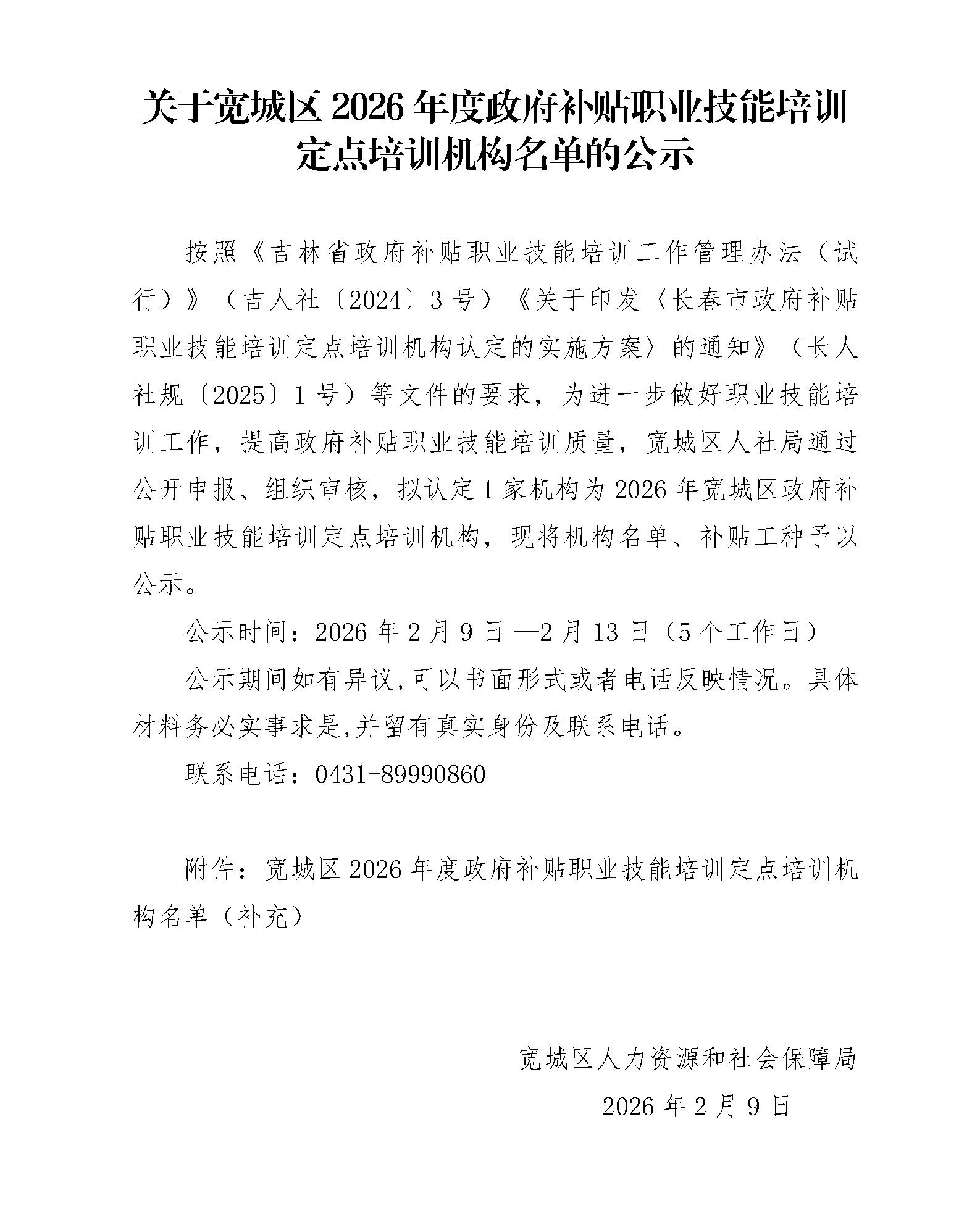 关于宽城区2026年度政府补贴职业技能培训定点培训机构名单的公示