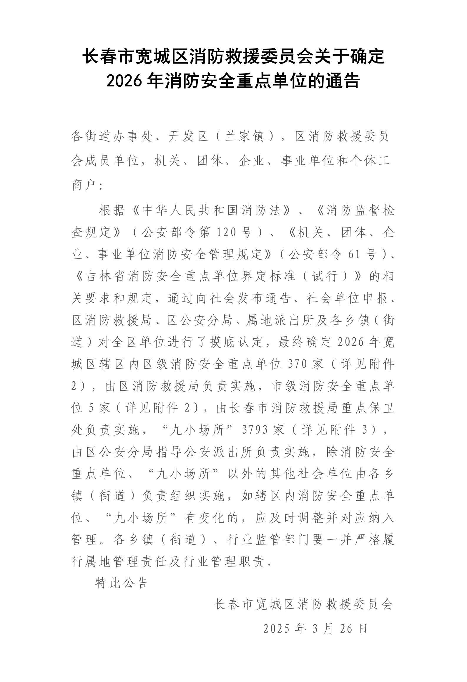 长春市宽城区消防救援委员会关于确定2026年消防安全重点单位的通告