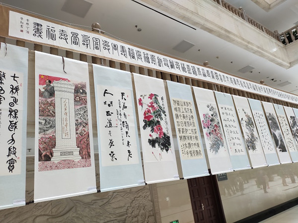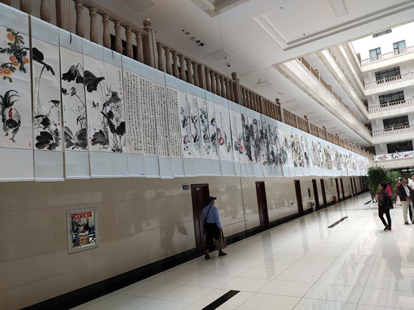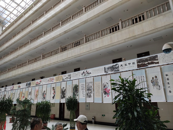 这些书画作品大多数出自中老年书画爱好者之手,经过统一装裱后,整齐悬挂在一楼大厅。一幅幅绘画作品或瑰丽宏伟或轻盈灵动,一幅幅书法作品或雄浑厚重或纤细秀美,其中最引人瞩目的无疑是两幅长卷,一幅七十米书画长卷,笔触自然流畅,生动感人,由七十名书画作者共同完成,敬祝祖国七十华诞生日快乐。另一幅三十米书法长卷“福寿中华”由张学勤老师挥毫而做,一百个不重样的“福、寿”二字,祝福我们伟大祖国福寿绵长。这些书画作者,最年长的已届八十高龄,他们伴随祖国成长,与祖国共同经历了那些最困苦的岁月,如今,祖国的繁荣富强为他们带来了晚年幸福的生活,他们用手中的笔把对党和祖国的崇敬热爱,化作一幅幅书画作品,尽情抒发着广大中老年爱党、爱国、爱家乡的浓厚深情。(撰稿、摄影:宋鹏达)