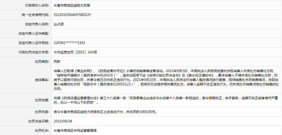 长春市宽城区益胜大药房【行政处罚】