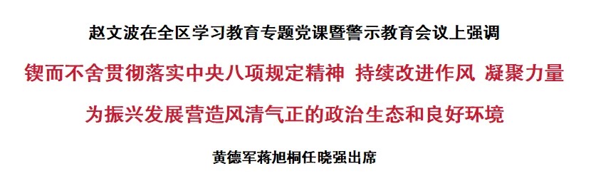 6月23日,全区学习教育专题党课暨警示教育会议召开。区委书记赵文波强调,要深入贯彻习近平总书记关于全面加强党的作风建设的重要论述和关于开展深入贯彻中央八项规定精神学习教育的重要讲话重要指示精神,深化以案说德、以案说纪、以案说法、以案说责,教育引导党员干部筑牢廉政防线,以更高的政治觉悟、更严的实践标准将作风建设贯穿始终。区委副书记、区长蒋旭桐出席并传达习近平总书记关于加强党的作风建设的重要论述。区人大常委会主任黄德军、区政协主席任晓强出席会议。