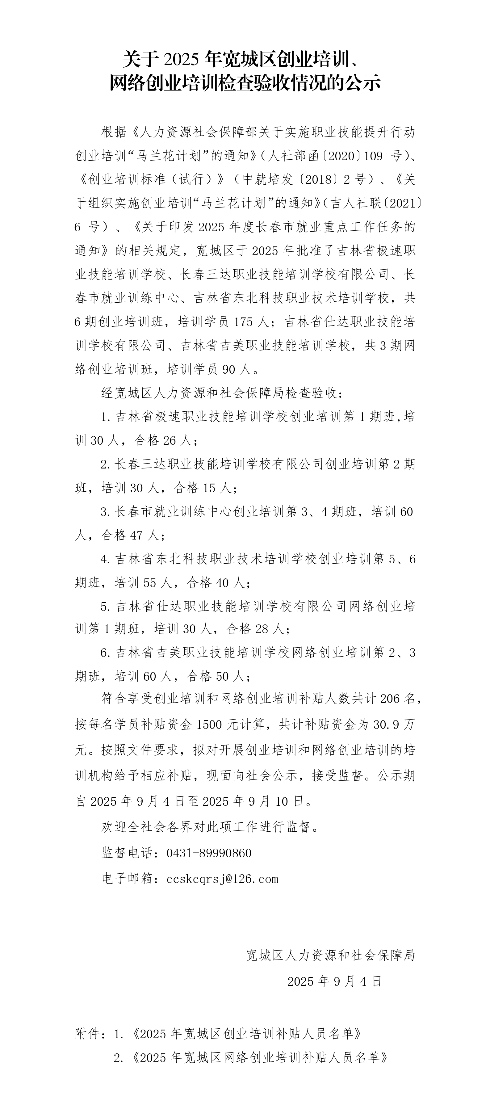 关于2025年宽城区创业培训、网络创业培训检查验收情况的公示