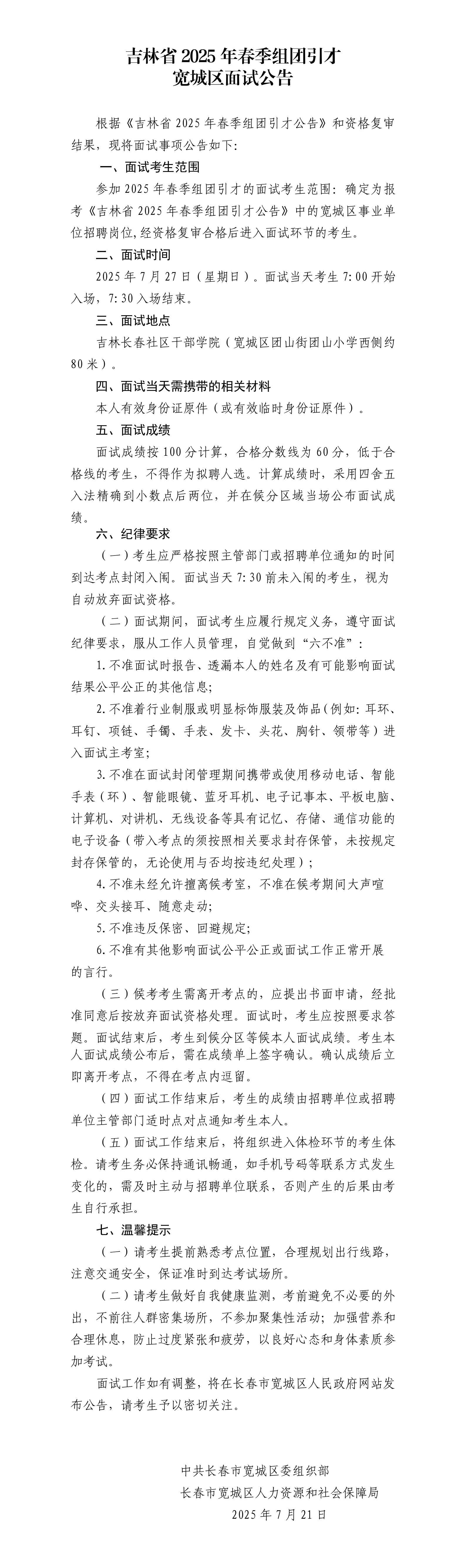吉林省2025年春季组团引才宽城区面试公告