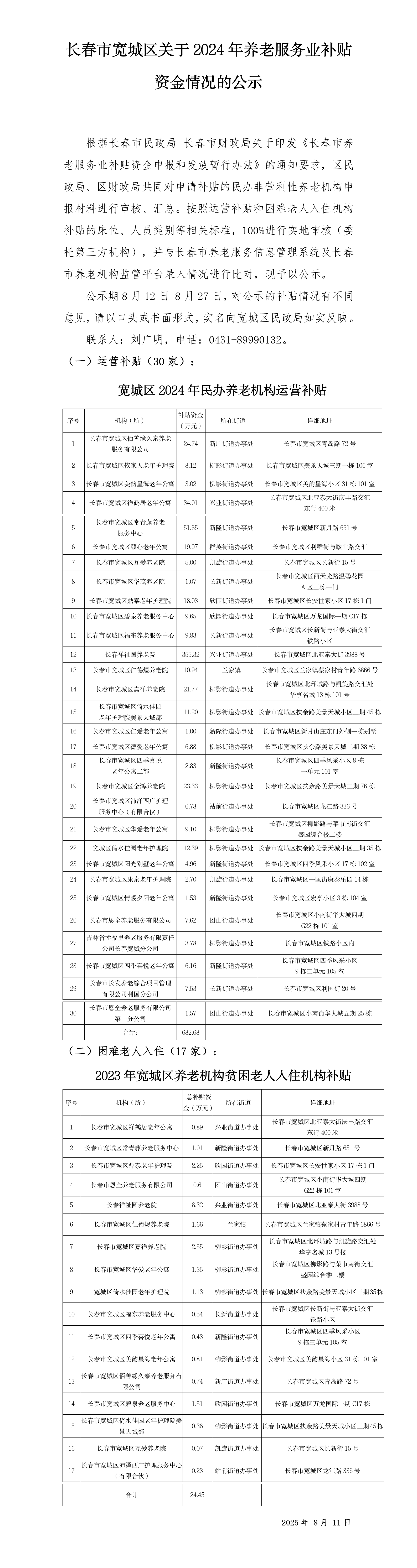 长春市宽城区关于2024年养老服务业补贴资金情况的公示