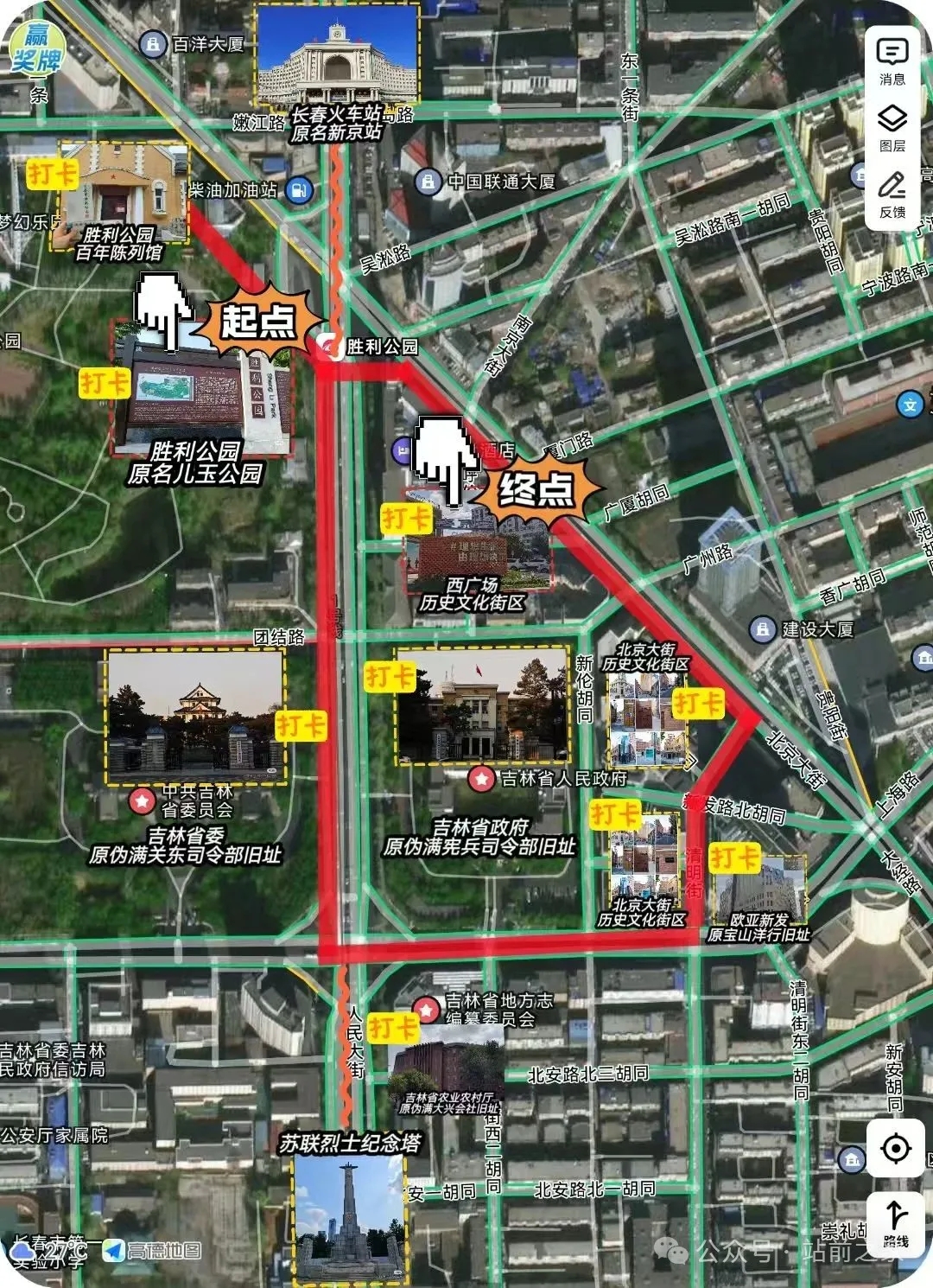 此项活动以胜利公园为起点,整个路线包含胜利公园内百年陈列室、人民大街中轴线、中共吉林省委员会、苏联烈士纪念塔、长春火车站、吉林省人民政府、伪满大兴会社旧址、欧亚新发原宝山洋行旧址、北京大街历史文化街区等长春地标性建筑物和历史性建筑物,终点为南广场历史文化街区。本次路线共计10个点位,围绕宽城区17处文物建筑进行义务宣讲,这条路线不仅串联起了长春的城市地标,更简要展示出了长春从殖民统治到民族解放的壮阔历史,沿途每一处建筑都镌刻着时代的印记。