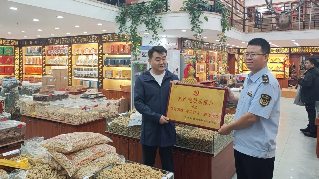 坚持党建引领,大力宣传“党建强、发展强”先进典型,广泛开展党员“亮身份、亮职责、亮承诺”活动,为6户典型党员颁发了“共产党员示范户”和“共产党员经营户”牌匾,引导和激励个体工商户创新发展。同时,按照分级分层原则,与“名特优新”培育相结合,建立分局领导帮扶个体工商户高质量发展“吉个通”服务矩阵,在辖区内选取80户个体工商户作为帮扶对象,促进个体工商户“个个”出彩。