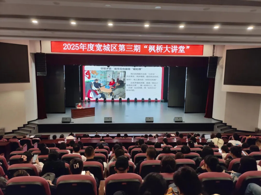 9月26日,宽城区“枫桥大讲堂”第三期在欣园街道党群服务中心大礼堂开讲。区、街道(乡镇)、社区(村)三级综治中心工作人员、各级人民调解员200余人参加学习。