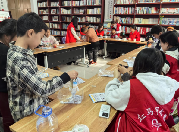 实验环节,学生们化身“小小科学家”,把矿泉水瓶变成吸尘器的外壳,使用纱布、纸巾作为过滤屏障,再仔细地连接好小电机和电池,通过变废为宝使废旧材料在巧手中焕发新生。当大家启动机器,桌面上的纸屑和杂物被吸入瓶中,在瓶内飞舞时,孩子们惊叹不已,脸上洋溢着成功的喜悦与自豪。家长们也积极参与,亲子协作默契而温馨。