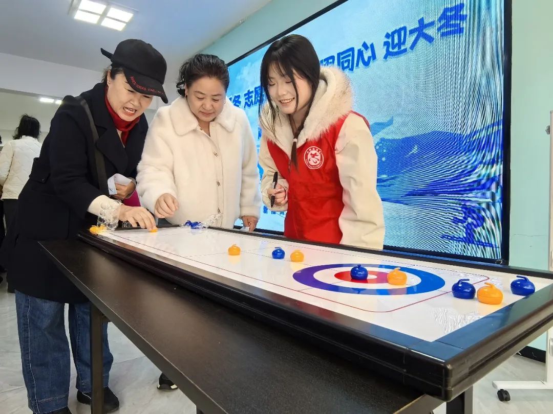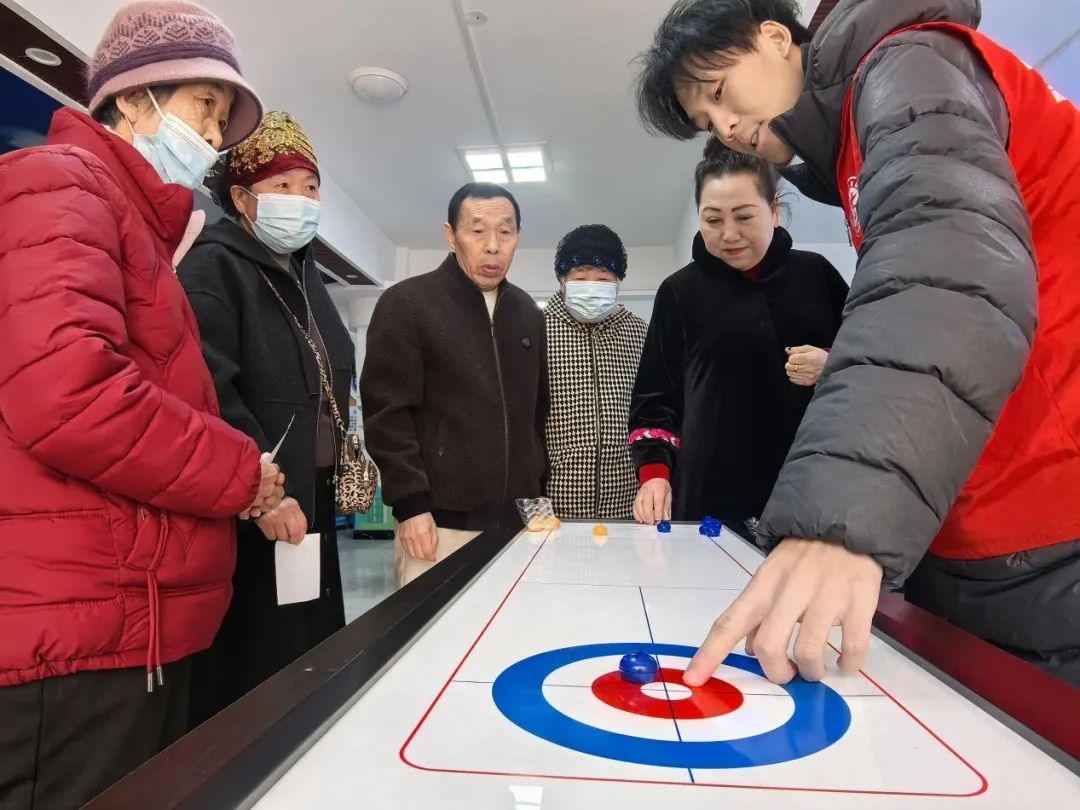 指尖“冰壶”体验区,志愿者们提前布置好体验场地,详细讲解动作要领,居民们分组对抗、有序闯关,抬手、推送、瞄准,每一个动作都有模有样,在体验冰壶运动乐趣的同时,考验着彼此的默契与技巧,现场不时响起阵阵欢呼与掌声。