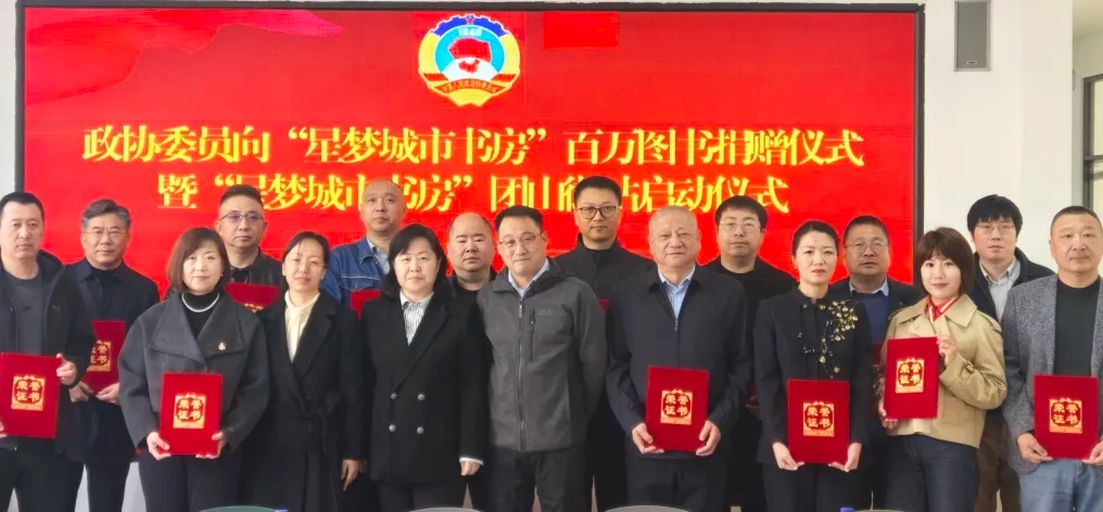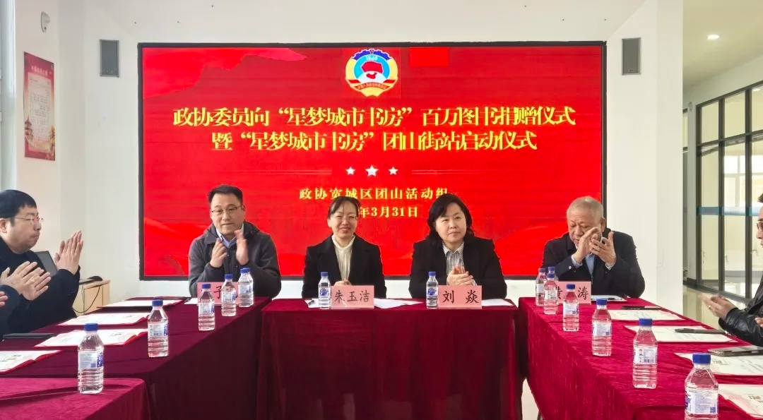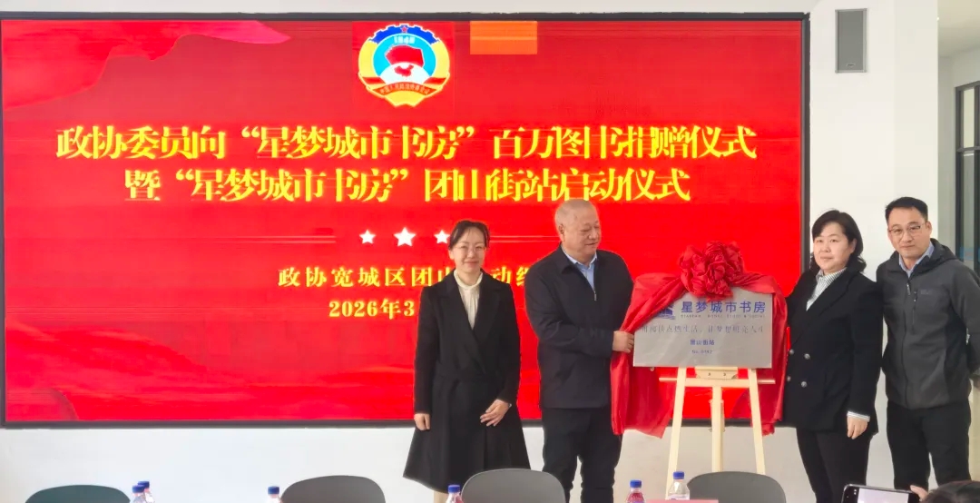 宽城区政协教科卫体委主任刘焱、团山街道人大工委主任朱玉洁、政协团山活动组组长张子龙与宽城区政协常委黄立涛一道,共同为“星梦城市书房”团山街站揭牌。