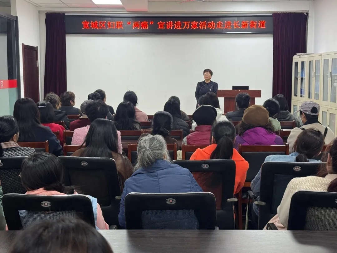 为进一步提升辖区妇女群众的健康防护意识,普及“两癌”防治知识,切实把关爱女性健康的服务送到群众身边,3月30日下午,宽城区妇联在长新街道天波社区开展“两癌”宣讲进万家活动,为辖区妇女群众带来了一场专业、实用的健康知识专题讲座,本次活动共吸引辖区40余名妇女群众踊跃参与。